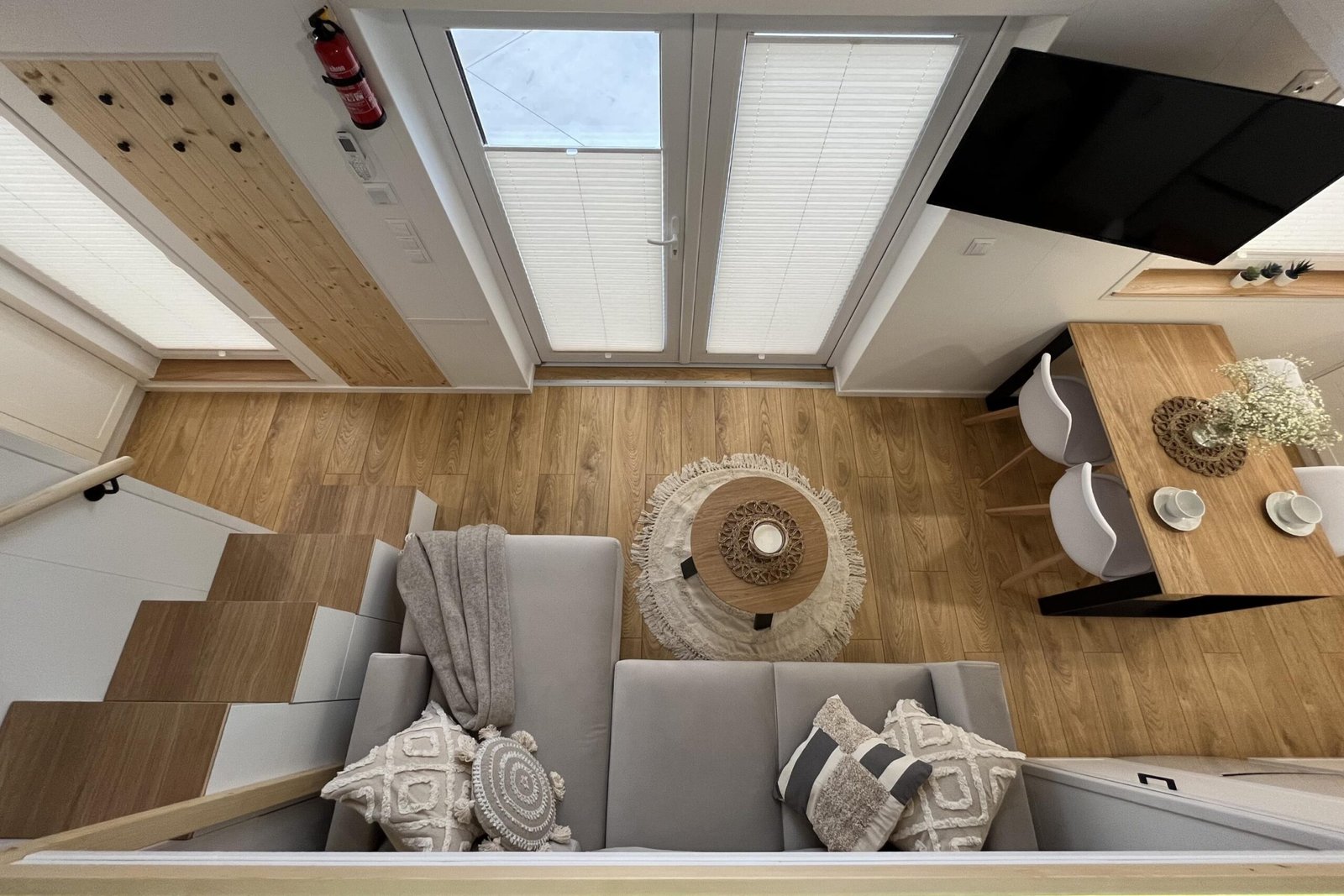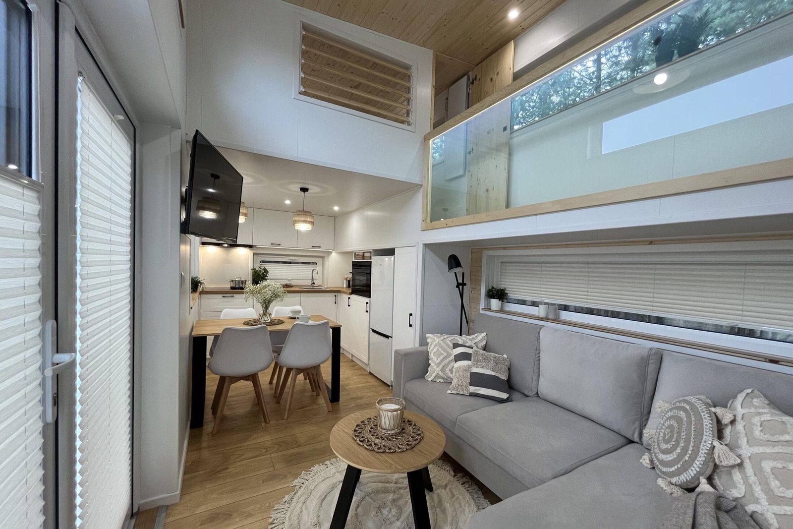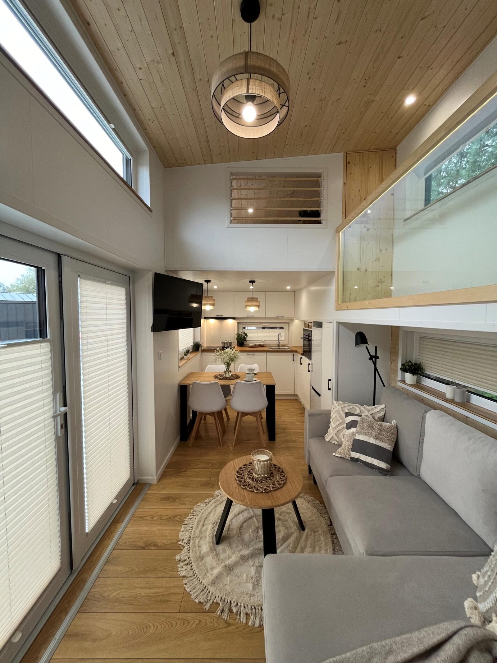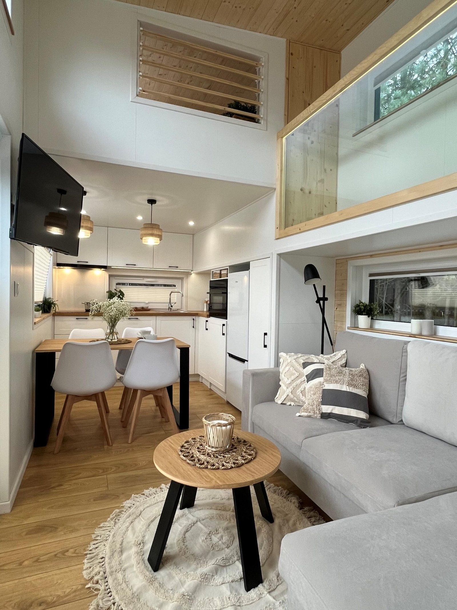 L’espace de vie principal comprend un grand salon et une cuisine entièrement équipée, conçus pour allier fonctionnalité et esthétisme. Que vous aimiez recevoir ou profiter de moments de tranquillité, la Tiny House River s’adapte à toutes vos envies.